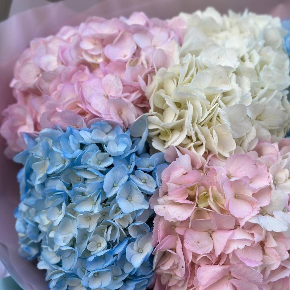 Букет из гортензии трех оттенков (голубой, белой и розовой) нежный и воздушный. Идеально подходит под любой торжественный случай.
